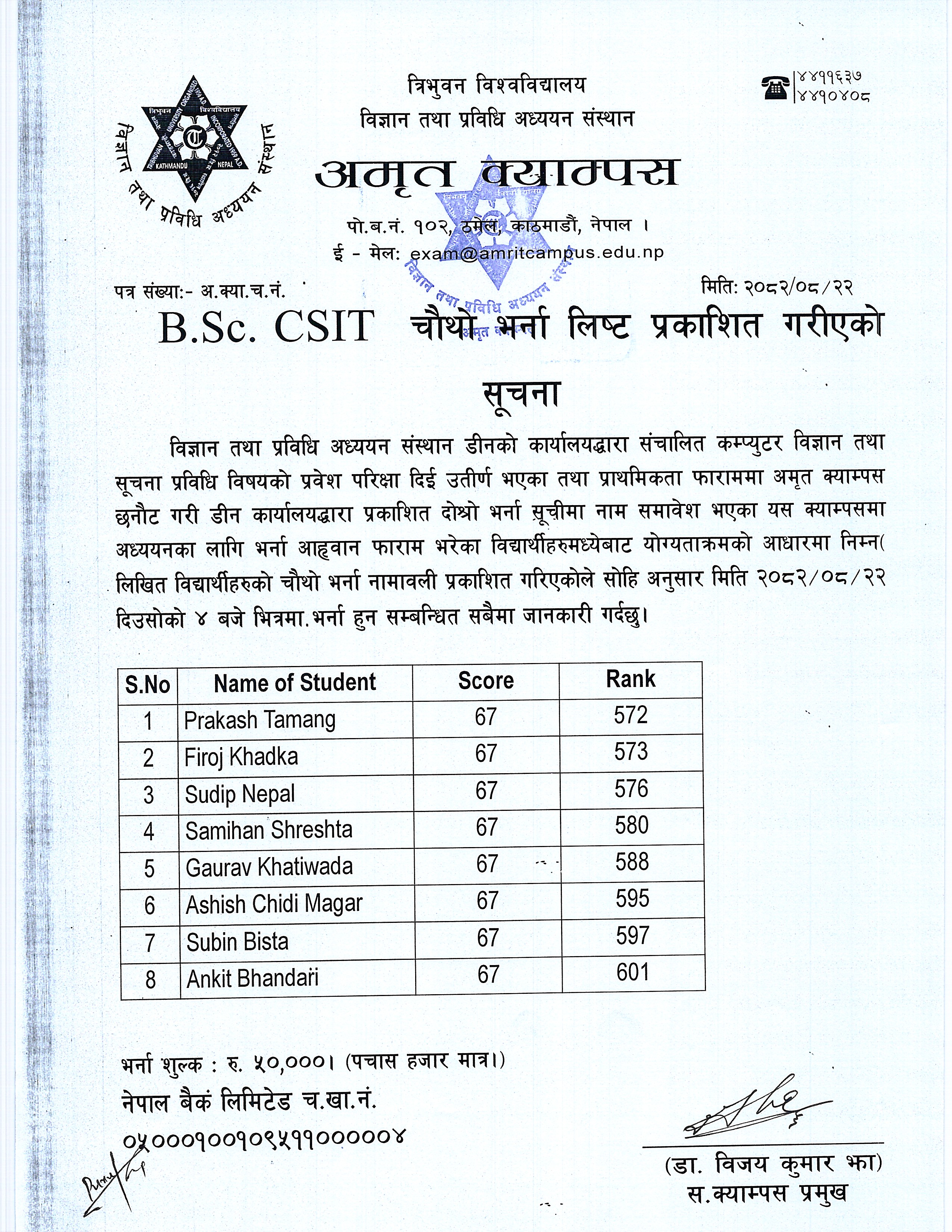स्नातक तह कम्प्युटर विज्ञान तथा सूचना प्रविधि विषयकाे चाैथाे भर्ना नामावली प्रकाशित गरीएकाे सूचना