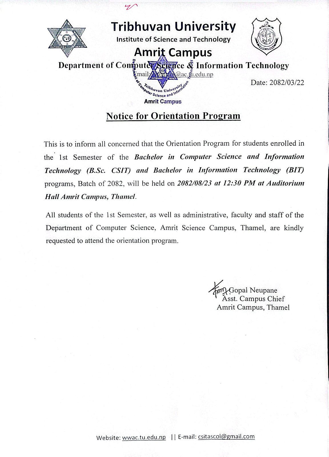 B.Sc.CSIT and BIT Orientation Program Notice 2082