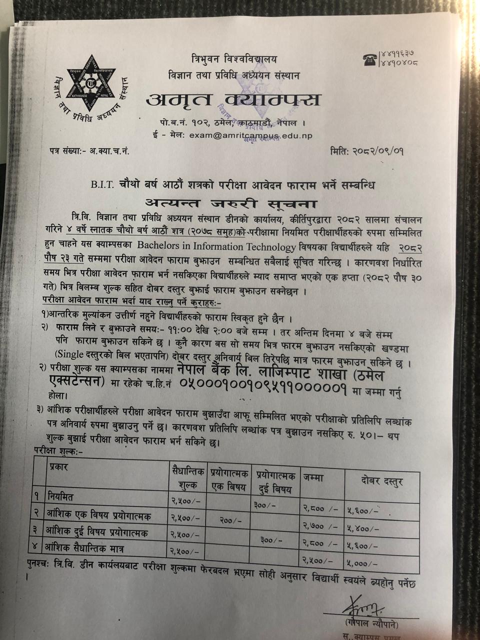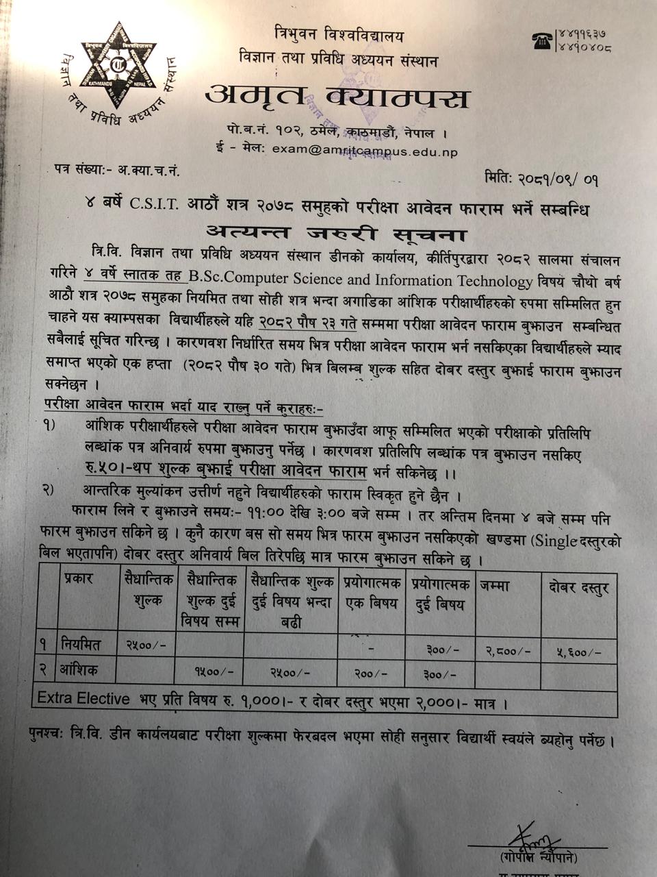 B.Sc.CSIT and BIT Exam form fill-up notice