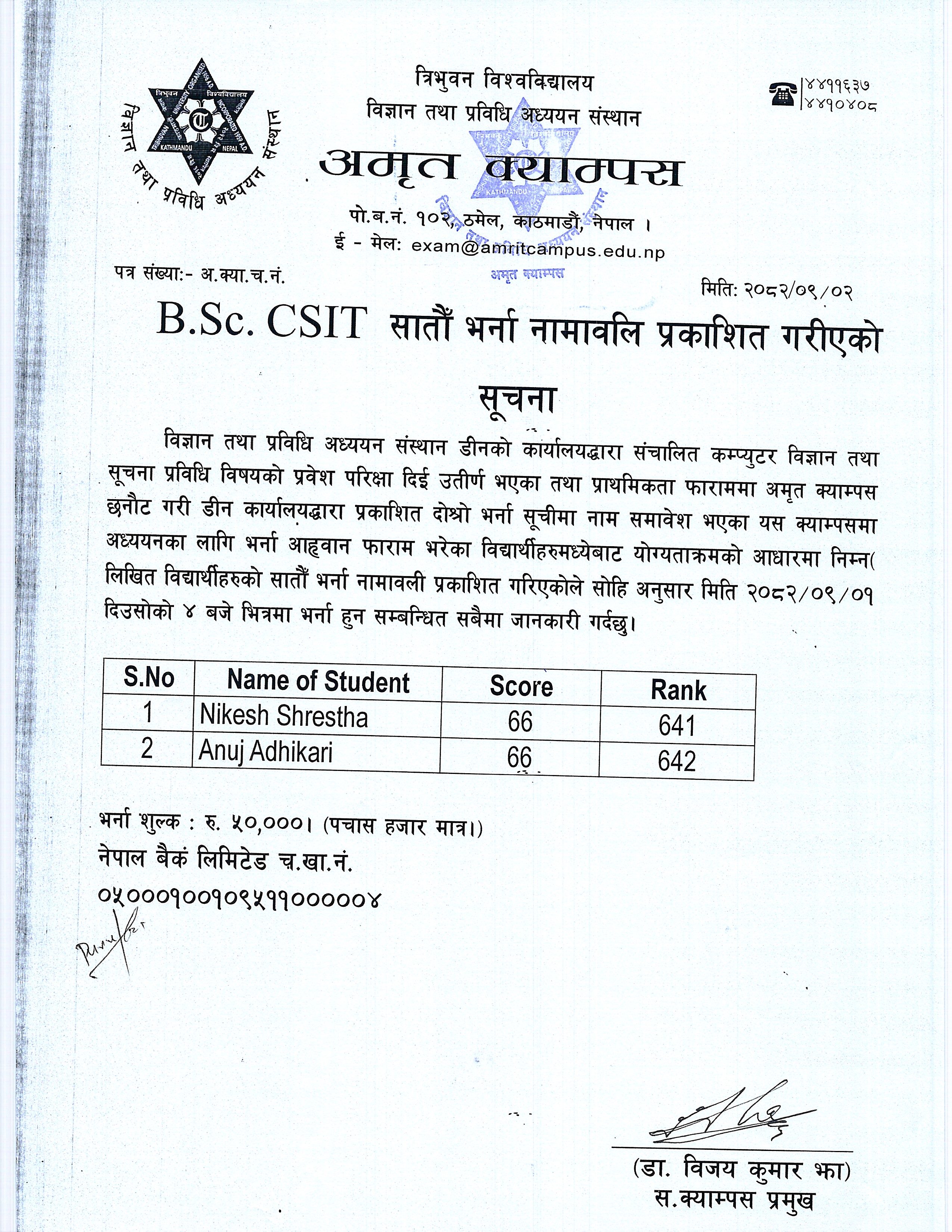 स्नातक तह कम्प्युटर विज्ञान तथा सूचना प्रविधि विषयकाे साताैँ भर्ना नामावलि प्रकाशित गरीएकाे सूचना