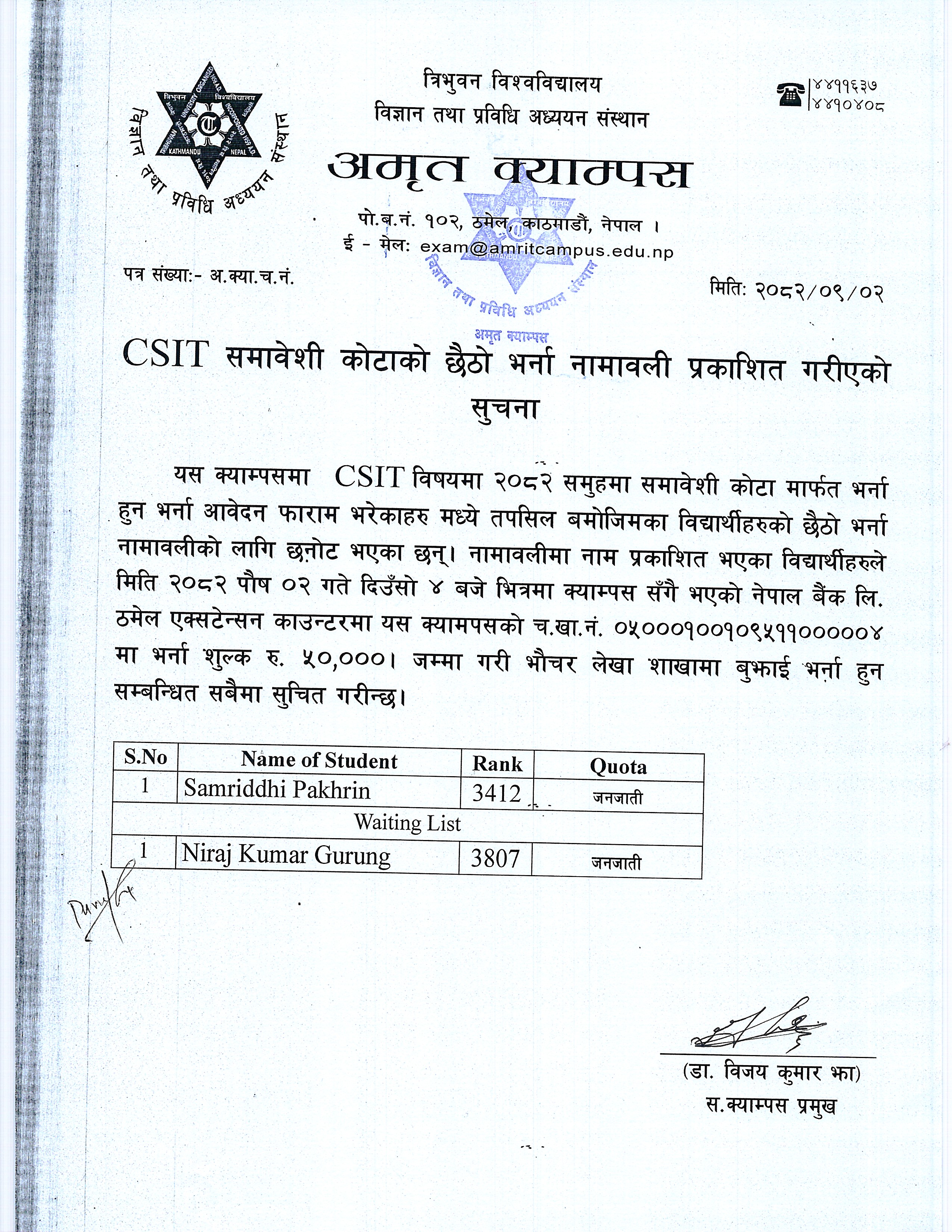 स्नातक तह कम्प्युटर विज्ञान तथा सूचना प्रविधि विषयकाे समावेशी तर्फ छैठाेँ भर्ना नामावलि प्रकाशित गरीएकाे सूचना