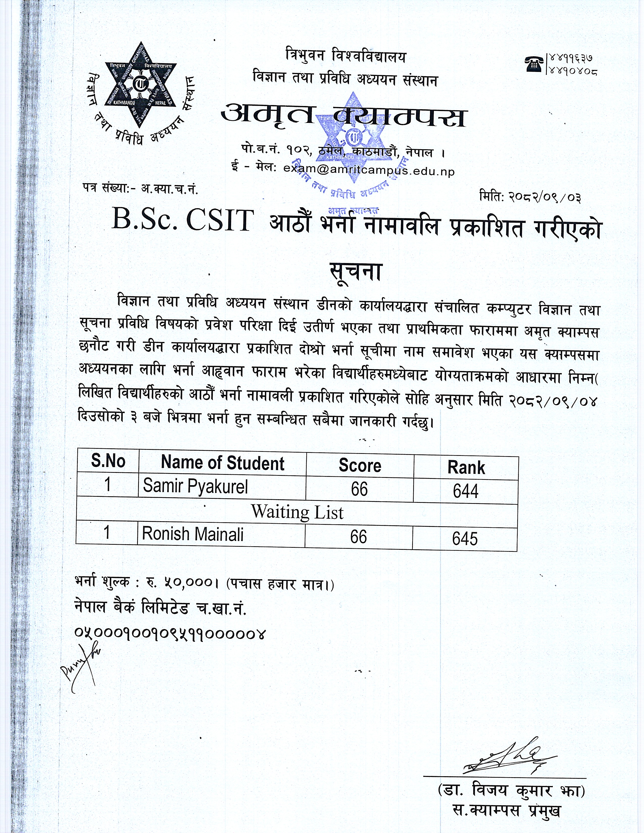 स्नातक तह कम्प्युटर विज्ञान तथा सूचना प्रविधि विषयकाे अाठाैँ भर्ना नामावलि प्रकाशित गरीएकाे सूचना