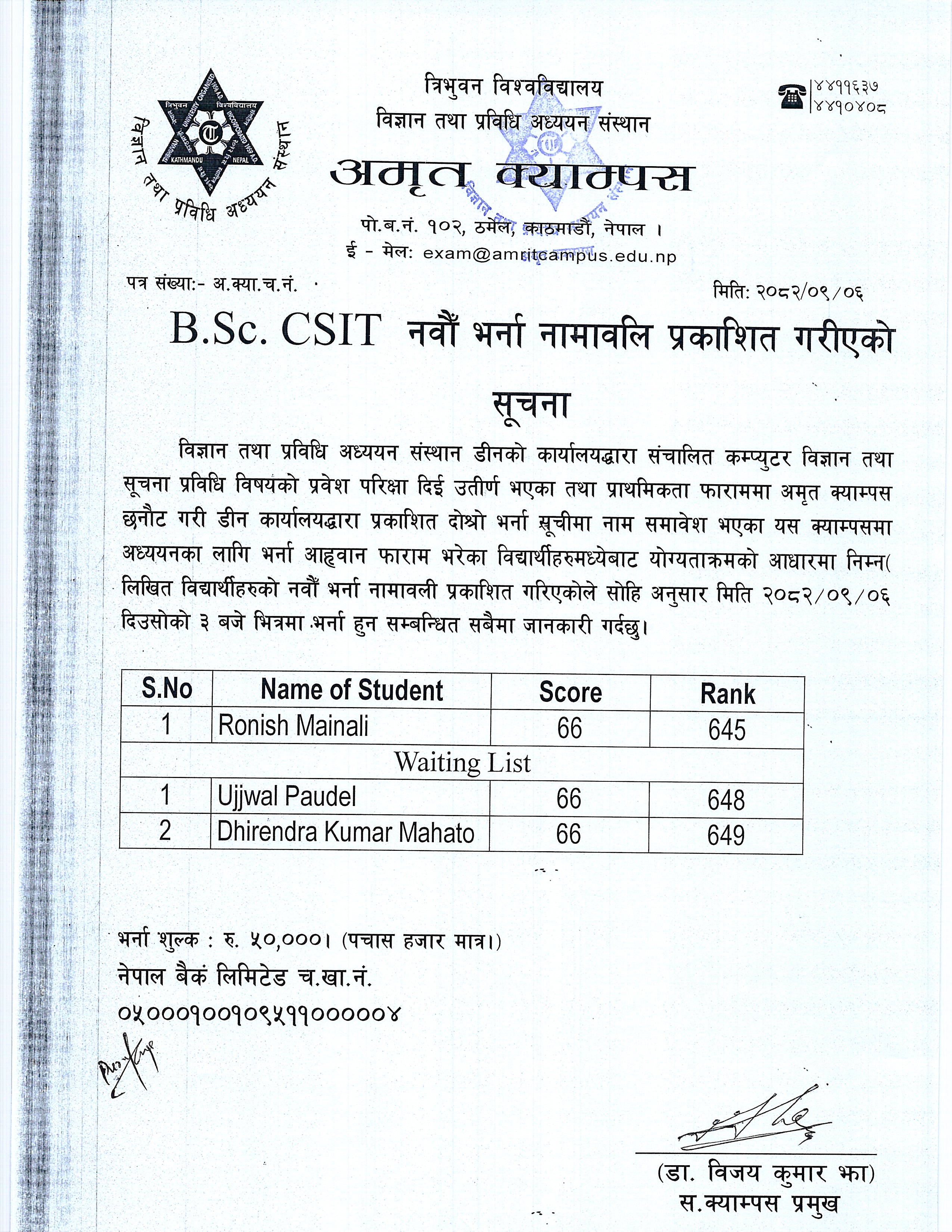 स्नातक तह कम्प्युटर विज्ञान तथा सूचना प्रविधि विषयकाे नवाैँ भर्ना नामावलि प्रकाशित गरीएकाे सूचना