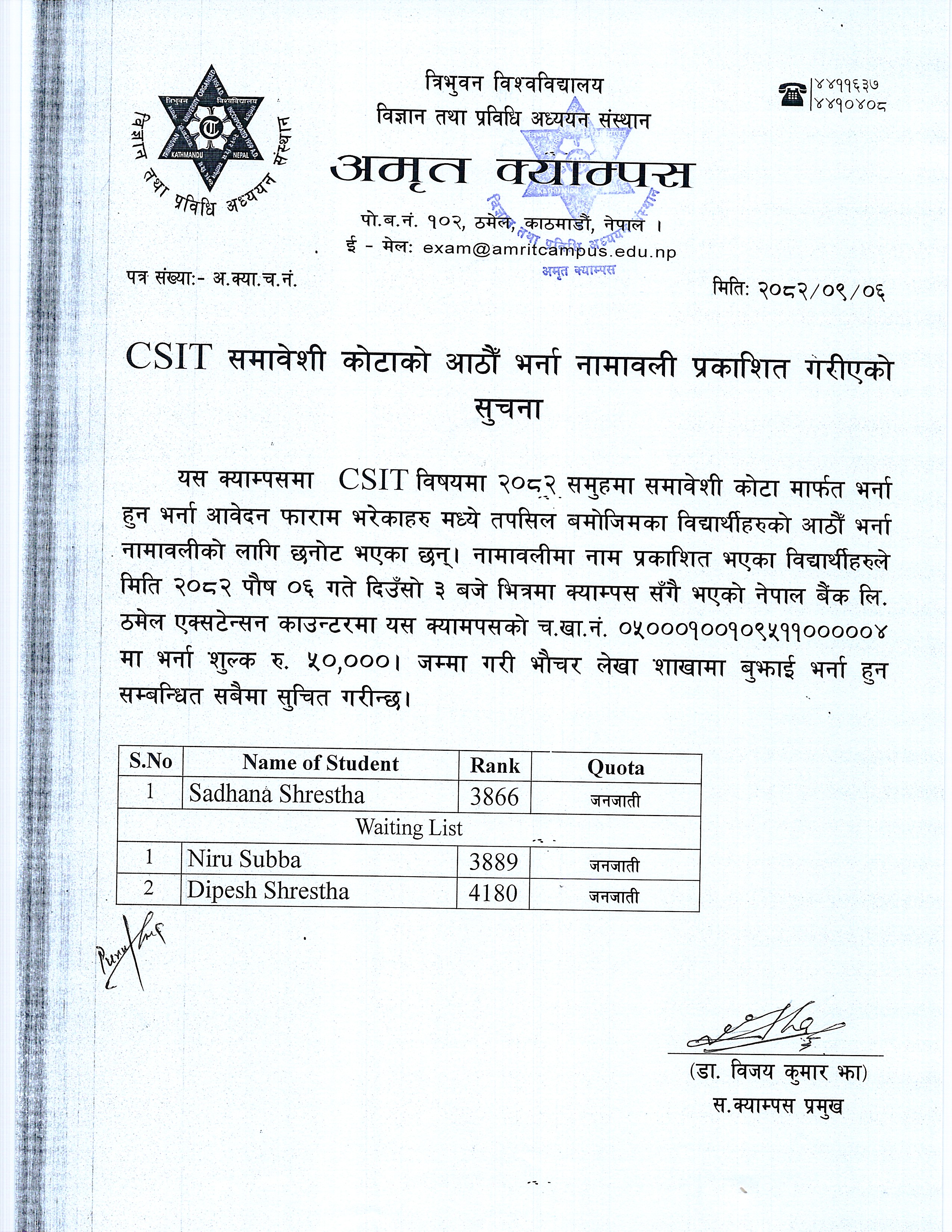 स्नातक तह कम्प्युटर विज्ञान तथा सूचना प्रविधि विषय समावेशी तर्फकाे अाठाैँ भर्ना नामावलि प्रकाशित गरीएकाे सूचना