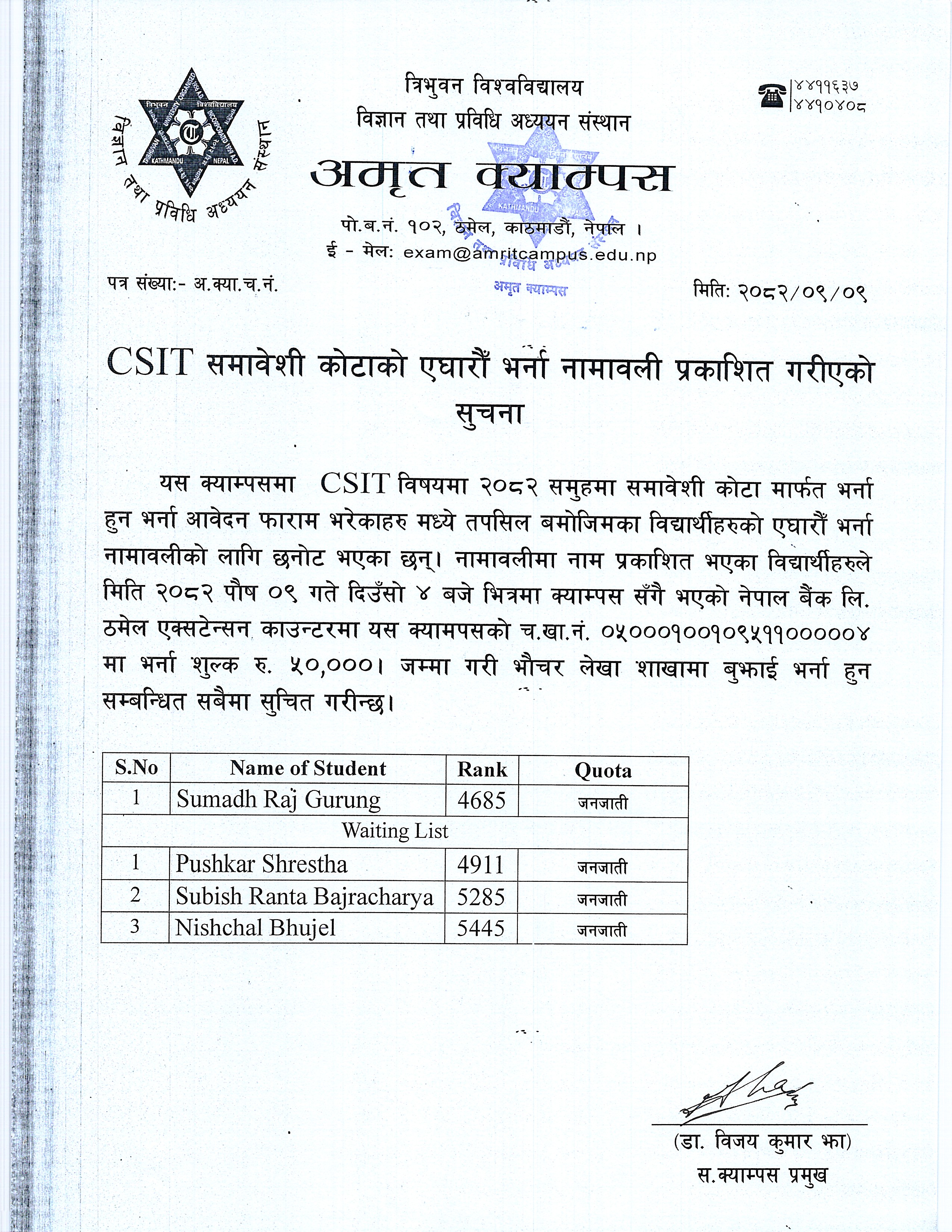 स्नातक तह कम्प्युटर विज्ञान तथा सूचना प्रविधि विषय समावेशी तर्फकाे एघाराैँ भर्ना नामावली प्रकाशित गरीएकाे सूचना