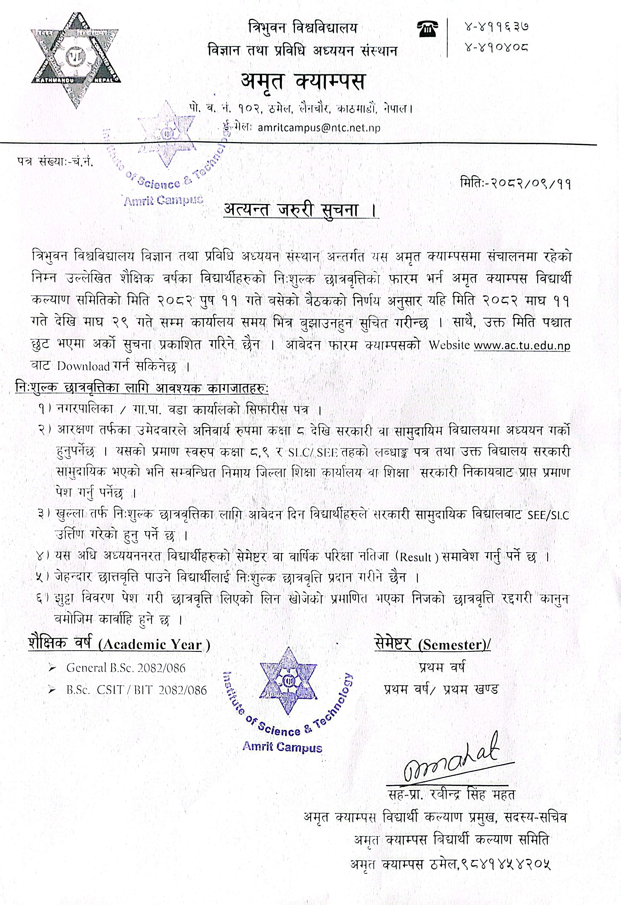 नि: शुल्क छात्रवृत्तिको लागि दरखास्त फाराम भर्ने सम्बन्धी सूचना। IOST, Amrit Campus