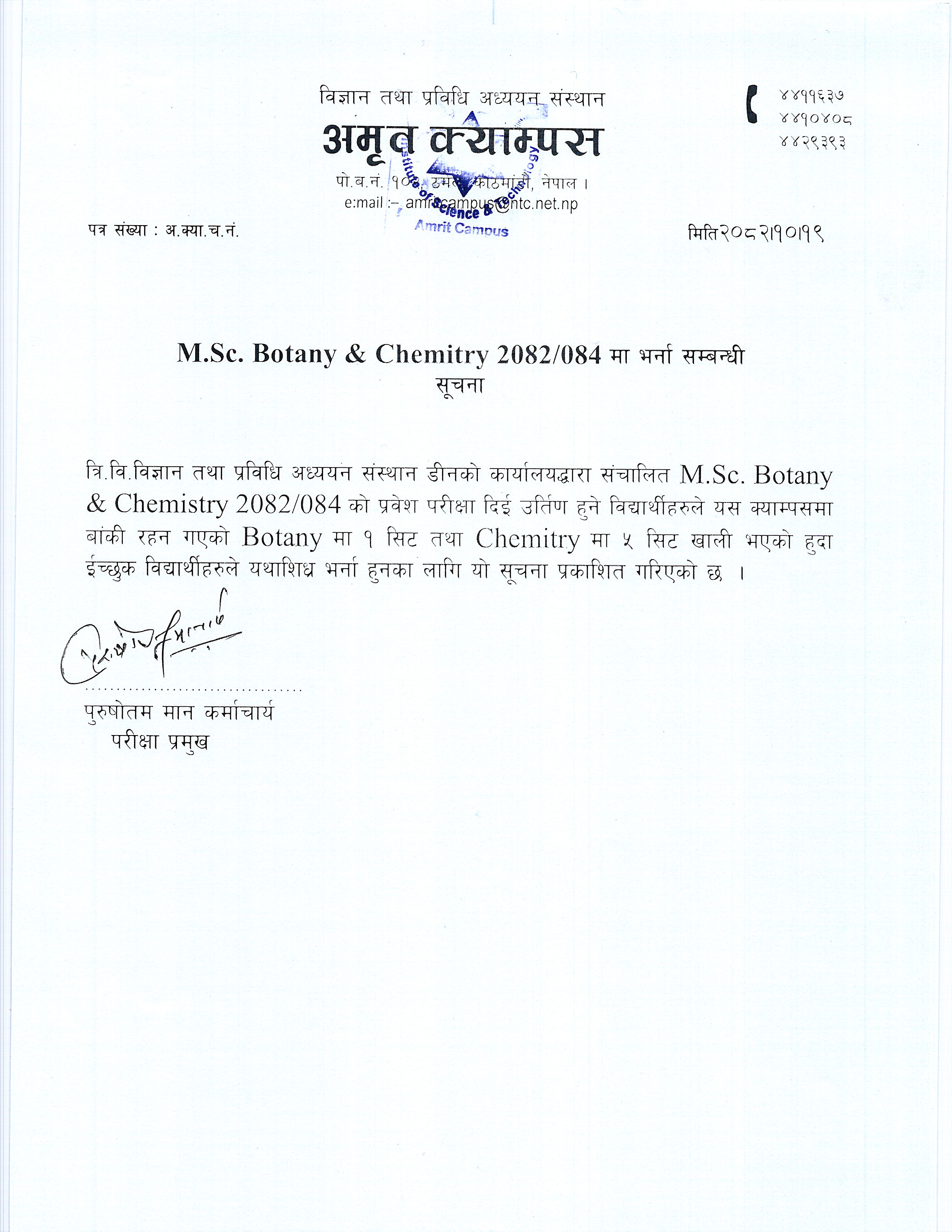 स्नातकाेतर तह वनस्पति तथा रसायन शास्त्रकाे भर्ना सम्बन्धि सुचना