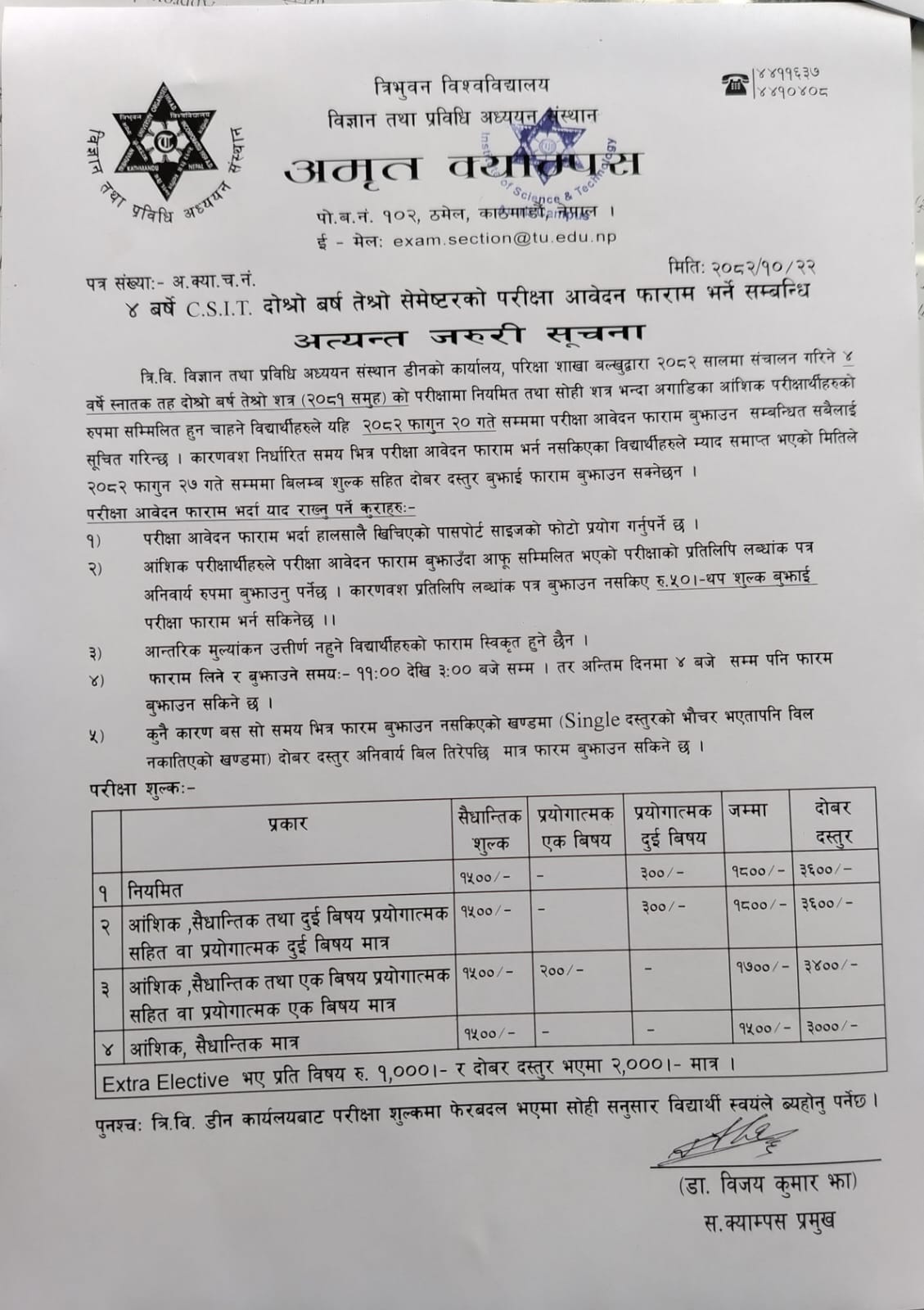 B. Sc. CSIT 2081 Third Semester Exam Form सम्बन्धी सूचना ।