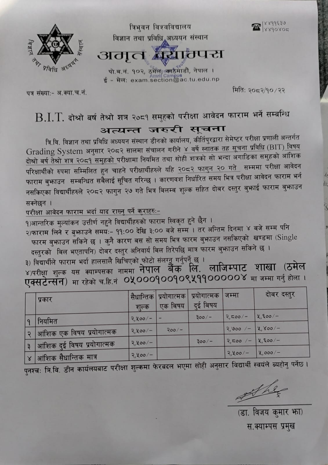 BIT 2081 Third Semester Exam Form सम्बन्धी सूचना ।