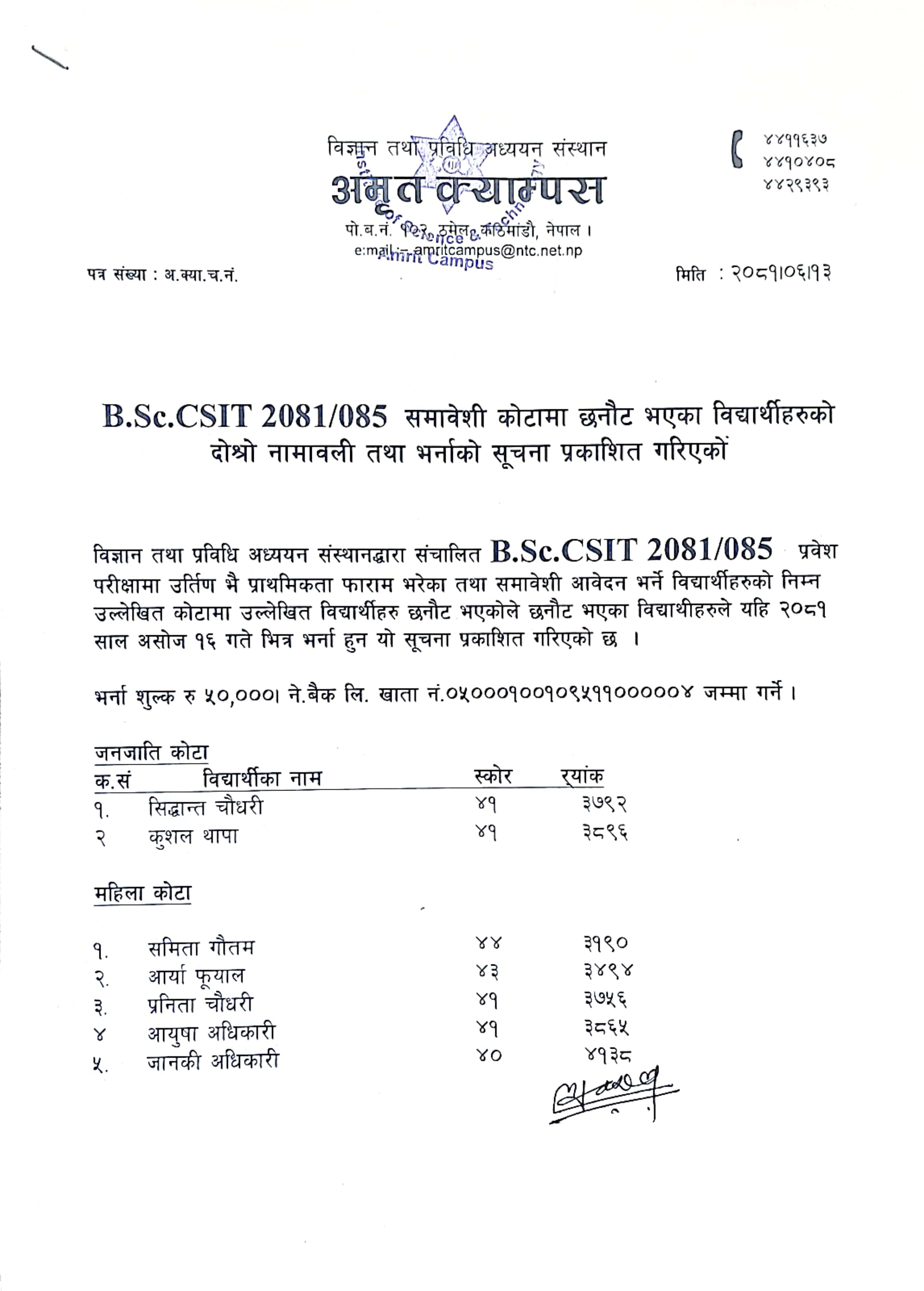 B.Sc.CSIT New Admission batch 2081 समुहको समावेशी कोटा तर्फको दिस्रो भर्ना लिस्ट प्रसाशित गरिएको वारे।