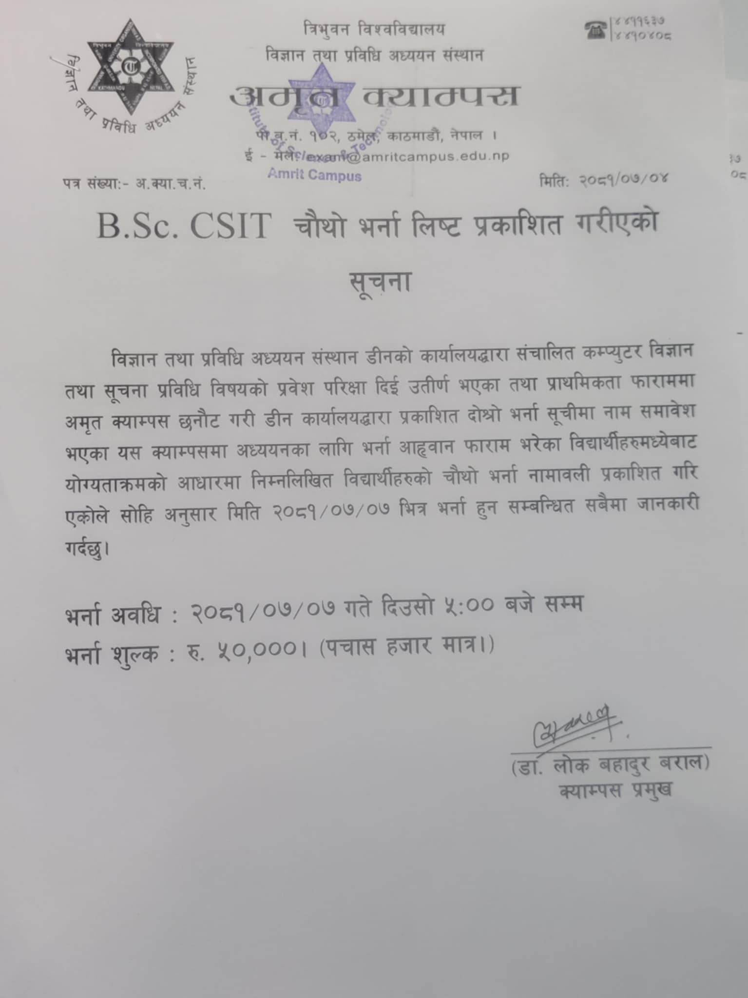 B. Sc. CSIT को चौथो भर्ना लिस्ट प्रकासित गरिएको सम्बन्धि सूचना।