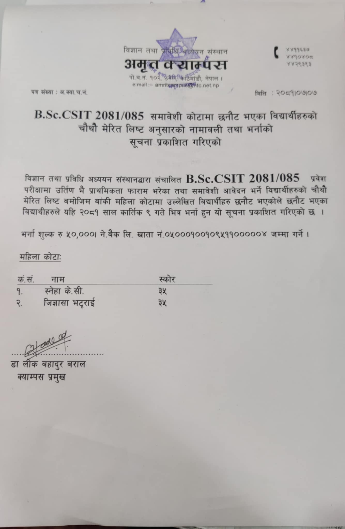 B. Sc. CSIT नयाँ भर्नाको समावेशी कोटामा छनोट भएका विद्यार्थीहरुको चौथो मेरिट लिस्ट अनुसारको नामवाली प्रकासन गरिएको सम्बन्धि सूचना ।
