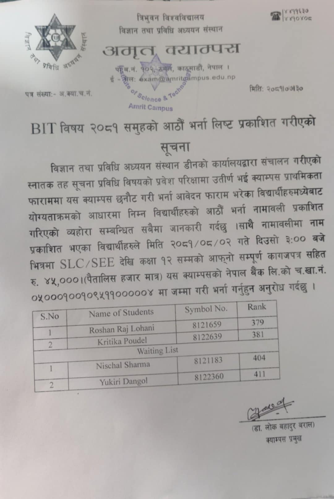 BIT Admission Notice with 8th Weating List