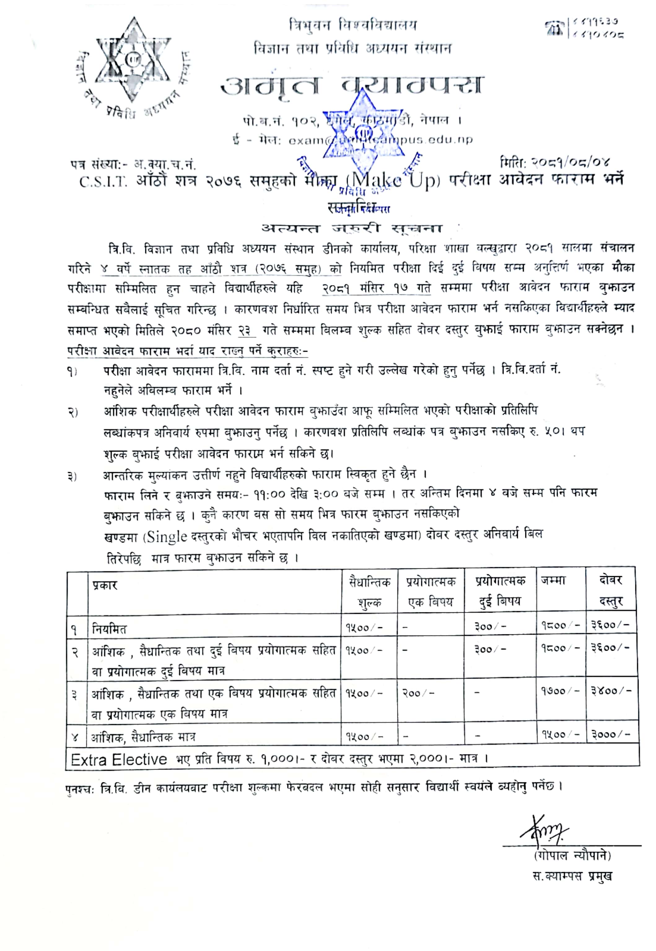 B. Sc. CSIT 8th Semester को मौका परीक्षा सम्बन्धि सूचना।