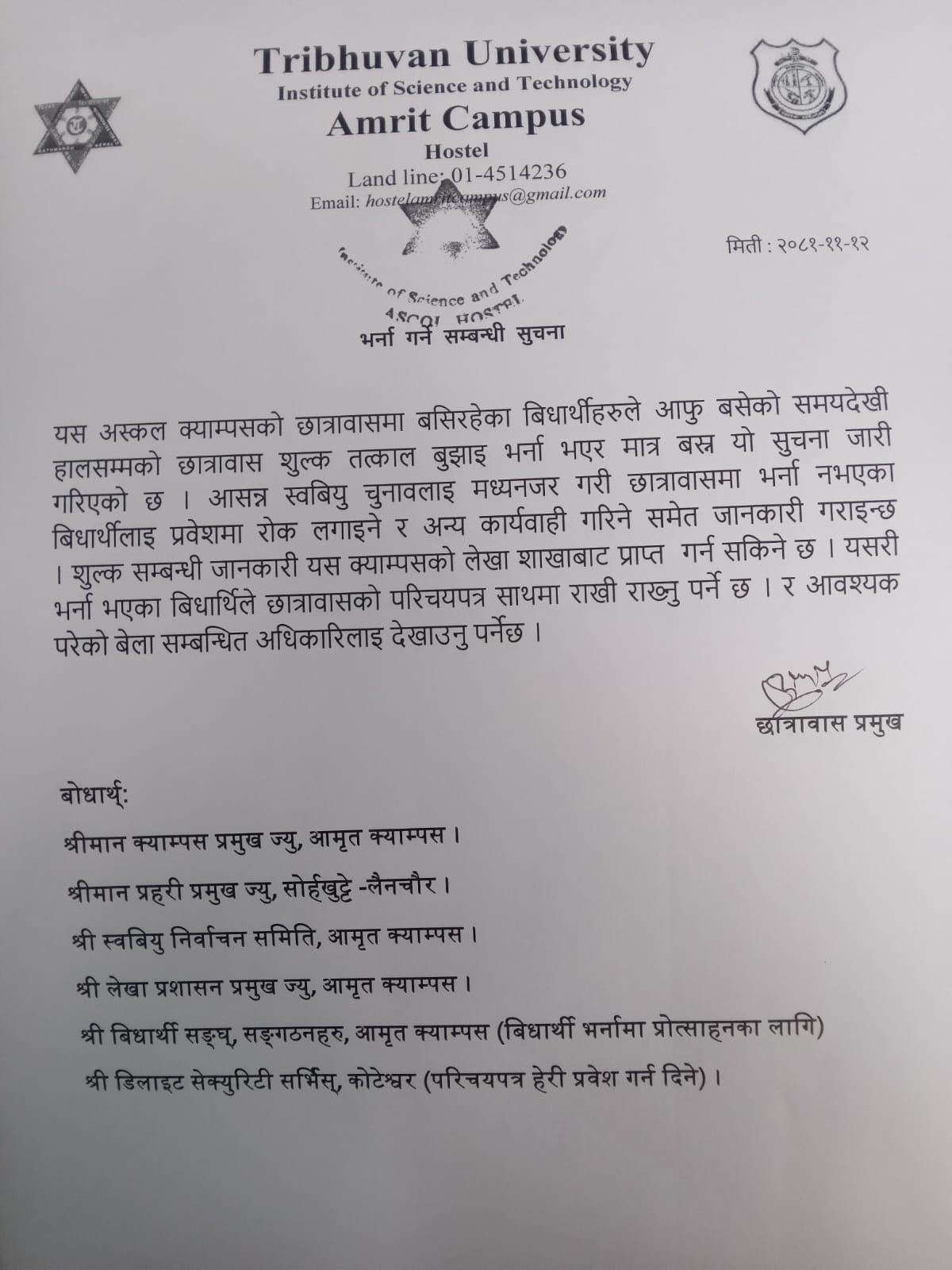 भर्ना हुने सम्बन्धी होस्टेलको सूचना।