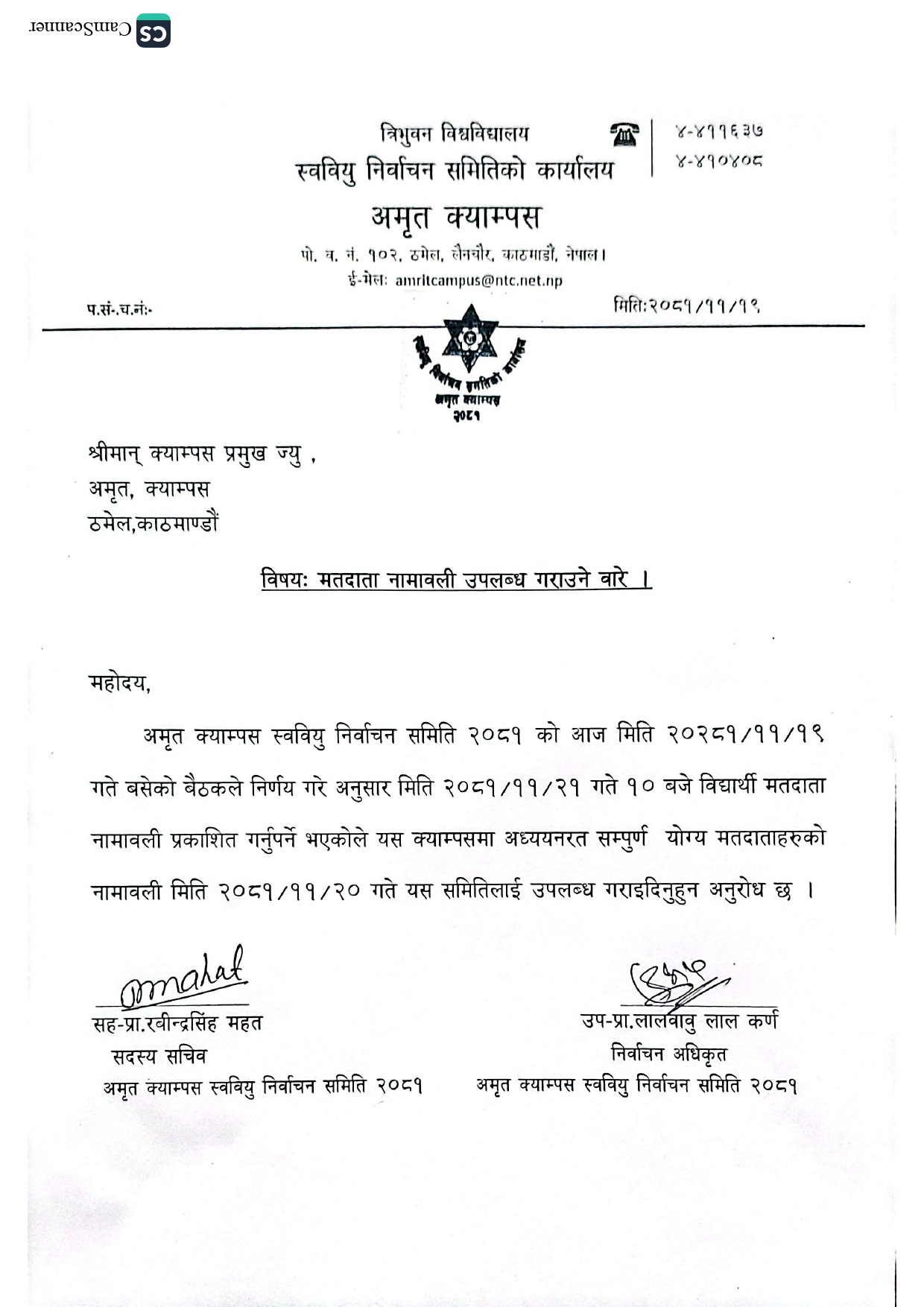 स्वतन्त्र विद्यार्थी युनियन निर्वाचनका नामावली माग गरिएको सम्बन्धी सूचना।