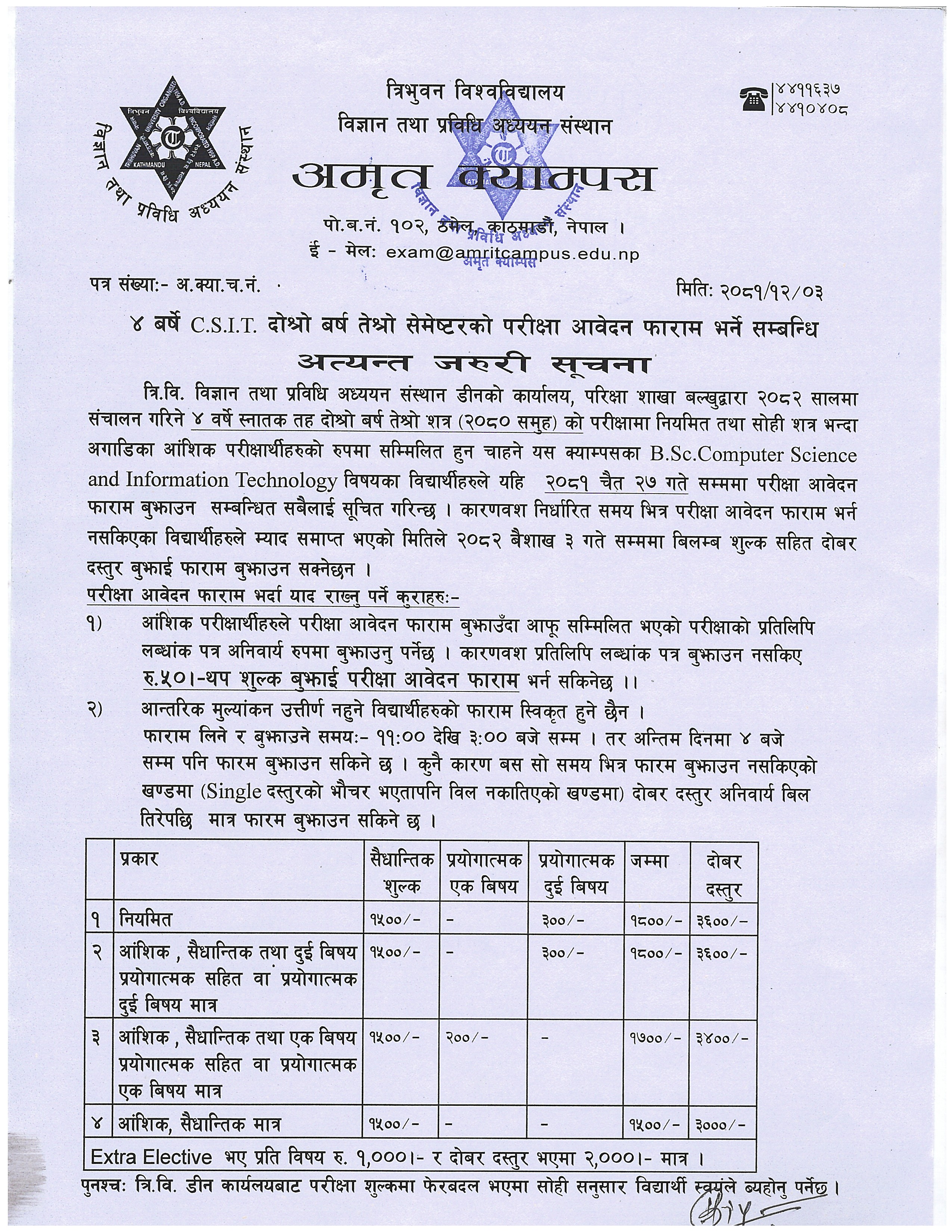 CSIT दाेश्राे बर्ष तेश्राे शत्रकाे परीक्षा फाराम भर्ने सूचना