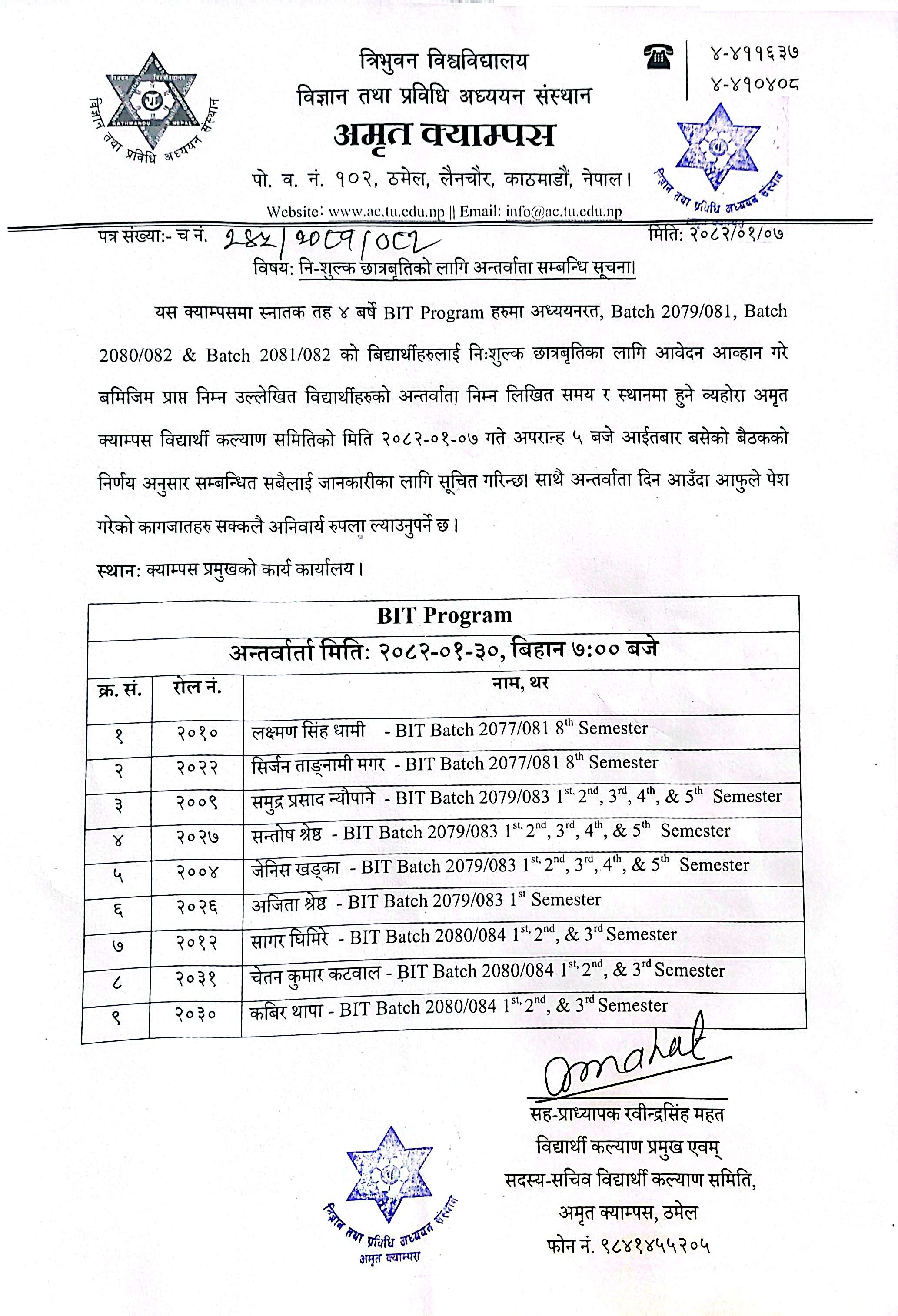 BIT छात्रवृतिको लागि अन्तर्वार्ता सम्बन्धि सूचना।