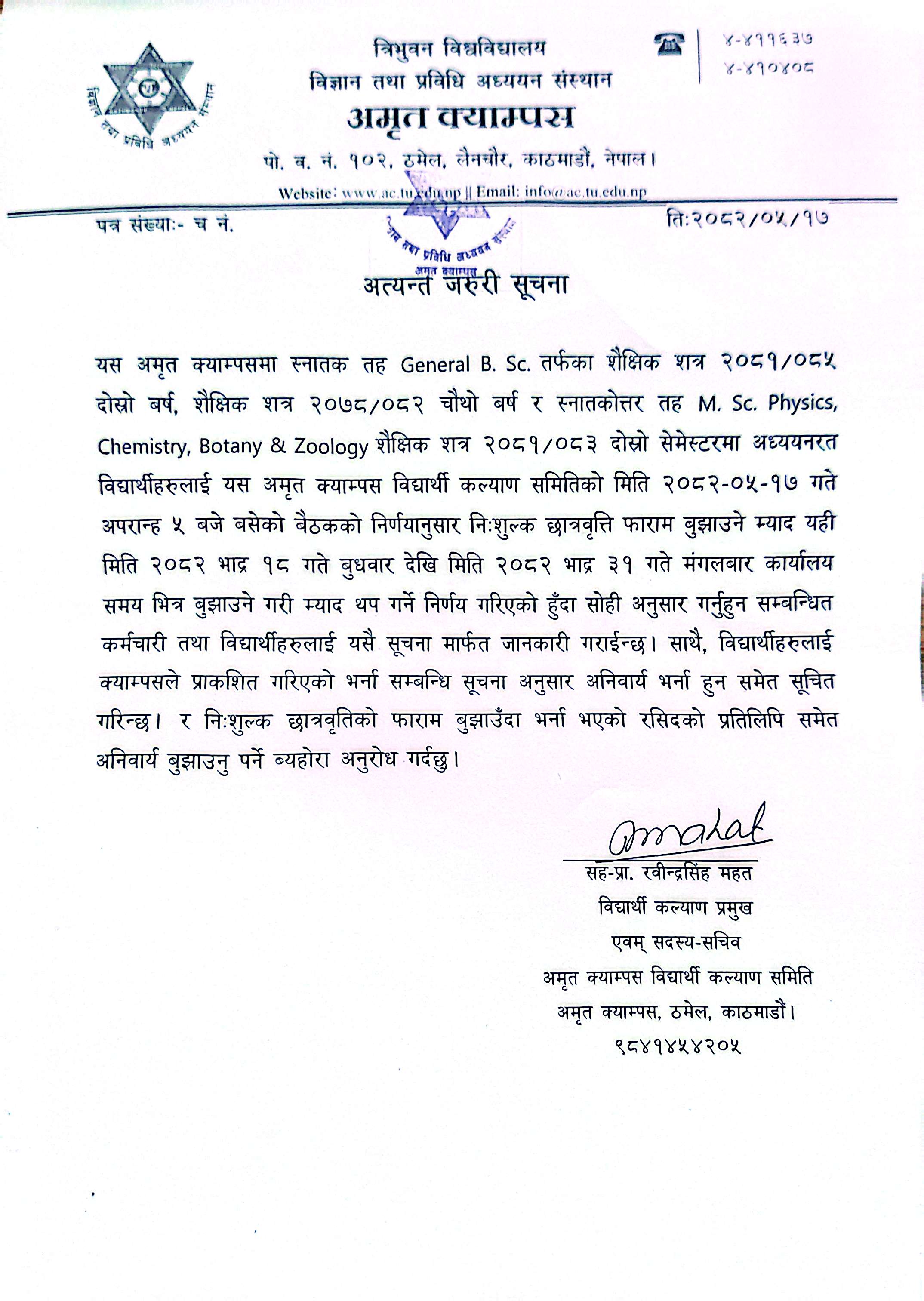 निःशुल्क छात्रवृत्ति सम्बन्धी फाराम भर्ने म्याद थप गरीएको सूचना।