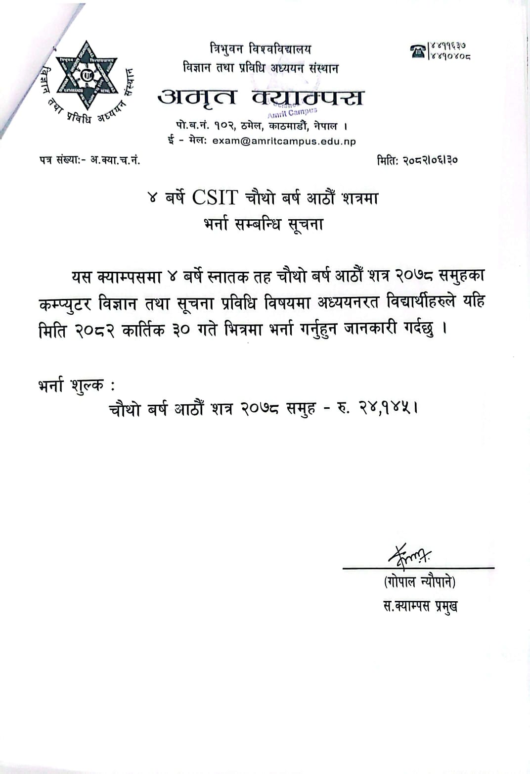 B.Sc.CSIT 4th Year 8th Semester admission notice.