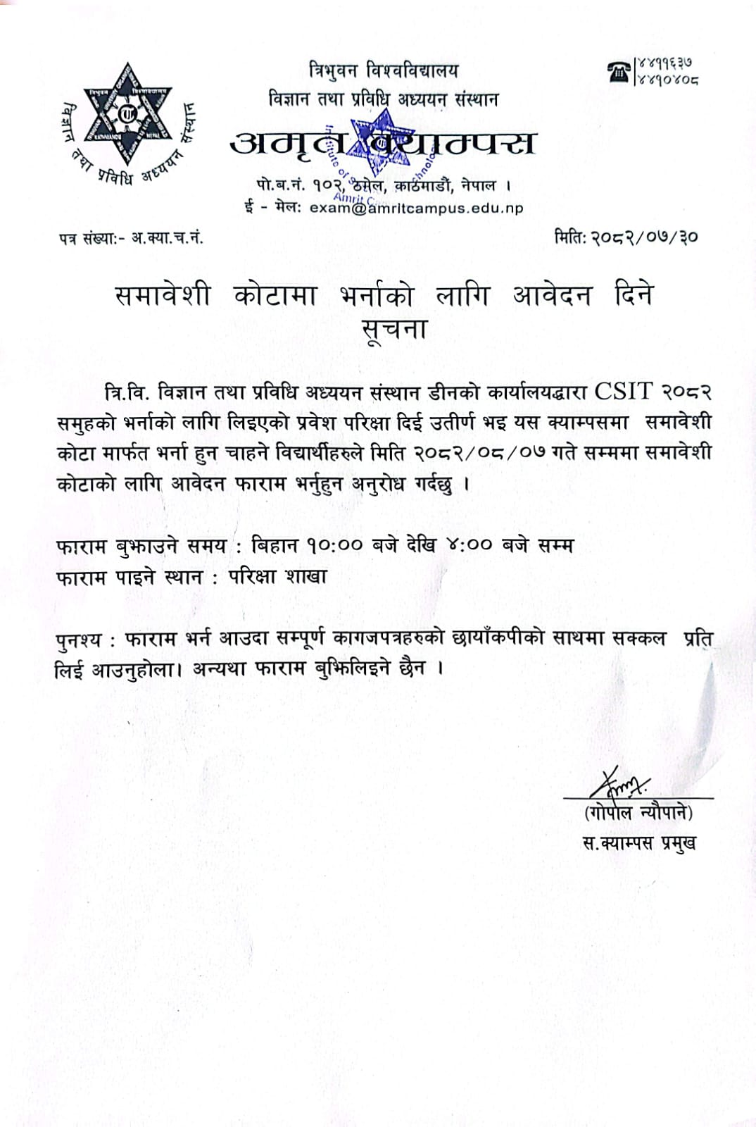 B.Sc.CSIT Batch 2082 नयाँ भर्नाको लागि समावेशी कोटाको फाराम भर्ने सम्बन्धि सूचना।